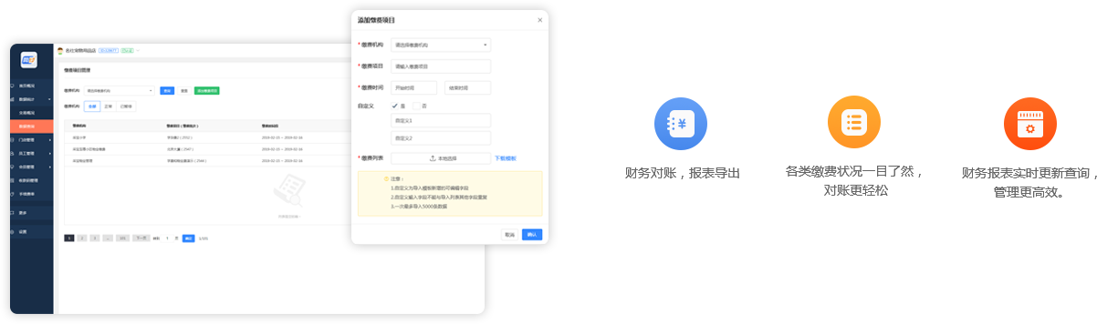 批量导入缴费人信息,缴费后自动生成电子表单,明细清晰有条理, 对账、查账很方便